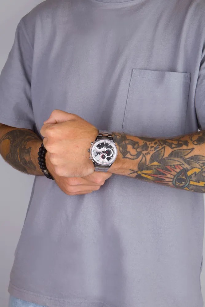 Мужские практичные часы с дополнительным отображением на малых циферблатах второго часового пояса, дня недели и текущего времени в 24-х часовом формате. Присутствует окошко даты. Браслет с раскладывающейся застежкой. Вес часов 150 грамм. Гарантия 1 год.