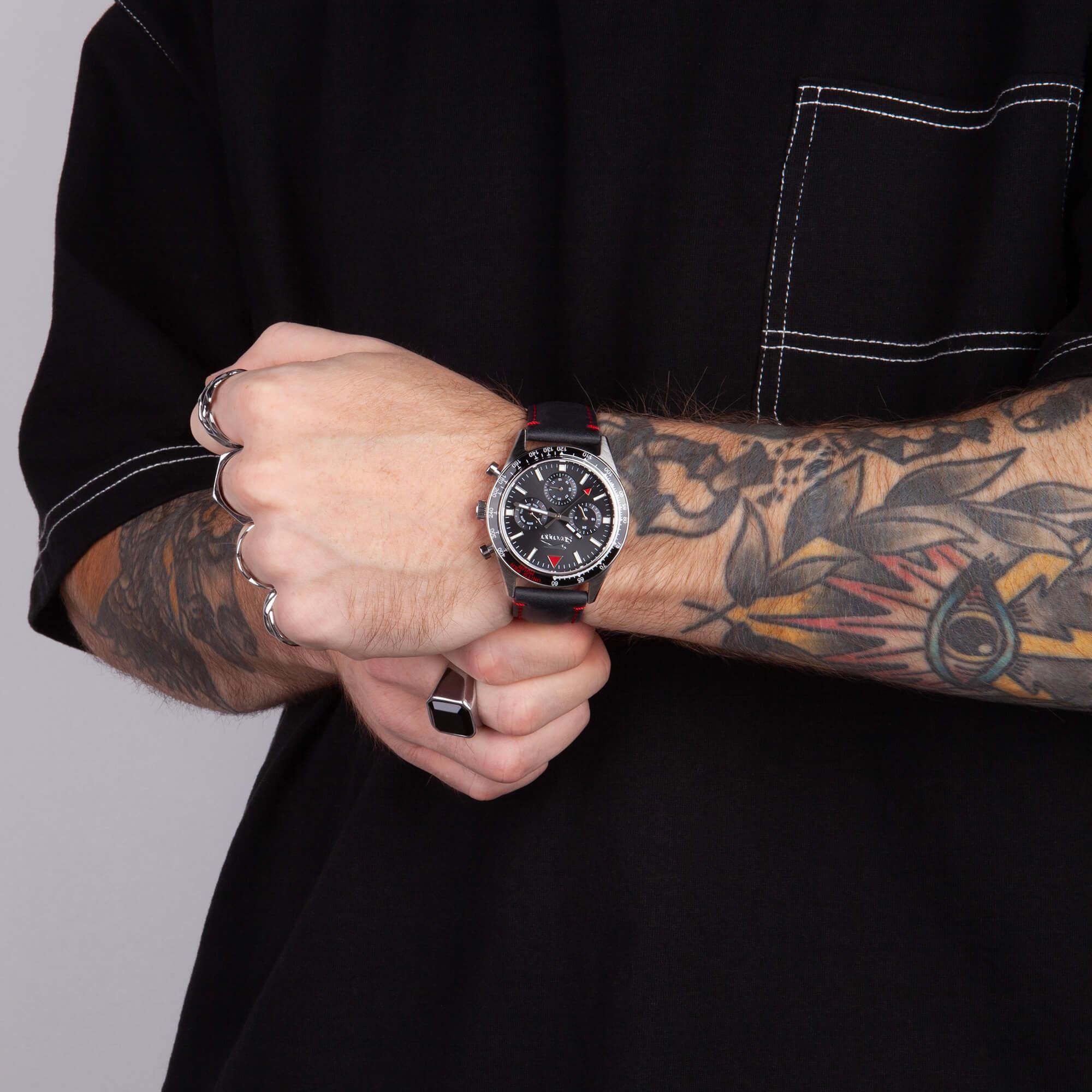 Мужские наручные часы с дополнительным отображением на малых циферблатах даты, дня недели и текущего времени в 24-х часовом формате. На безель нанесена разметка тахиметрической шкалы. Завинчивающаяся задняя крышка. Ремешок с классической застежкой. Вес часов 65 грамм. Гарантия 1 год.