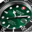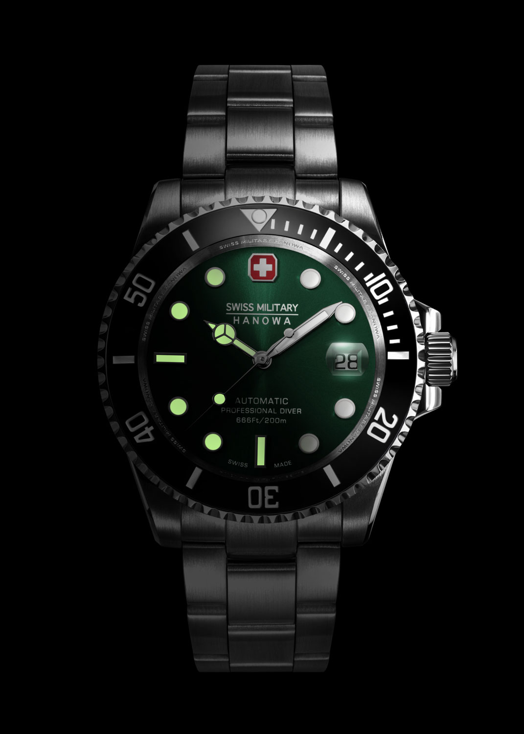 Швейцарские мужские часы Swiss Military Hanowa SMWGL0006302 из коллекции Sealord — это автоматические часы, разработанные для поклонников дайвинга и активного образа жизни. Корпус диаметром 41 мм изготовлен из нержавеющей стали и оснащен вращающимся керамическим безелем черного цвета, устойчивым к царапинам, который служит таймером для измерения времени погружения. Зеленый циферблат защищен сапфировым стеклом с антибликовым покрытием, а люминесцентные стрелки и метки гарантируют отличную читаемость даже в полной темноте. Внутри установлен швейцарский автоматический механизм Soprod P024 (на базе ETA 2824), работу которого можно наблюдать через прозрачную заднюю крышку. Часы обладают водозащитой 200 метров (20 ATM) и завинчивающейся заводной головкой с защитой, что делает их надежным инструментом для подводных приключений. Модель дополнена стальным браслетом с надежной раскладной застежкой и окошком даты с увеличительной линзой в положении 3 часа. Гарантия 3 года.