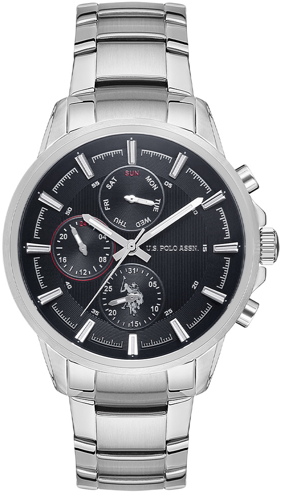 Стильные и практичные мужские часы с дополнительным отображением на малых циферблатах даты, дня недели и текущего времени в 24-х часовом формате. Заводная головка с защитой. Завинчивающаяся задняя крышка. Браслет с раскладывающейся застежкой. Гарантия 2 года.