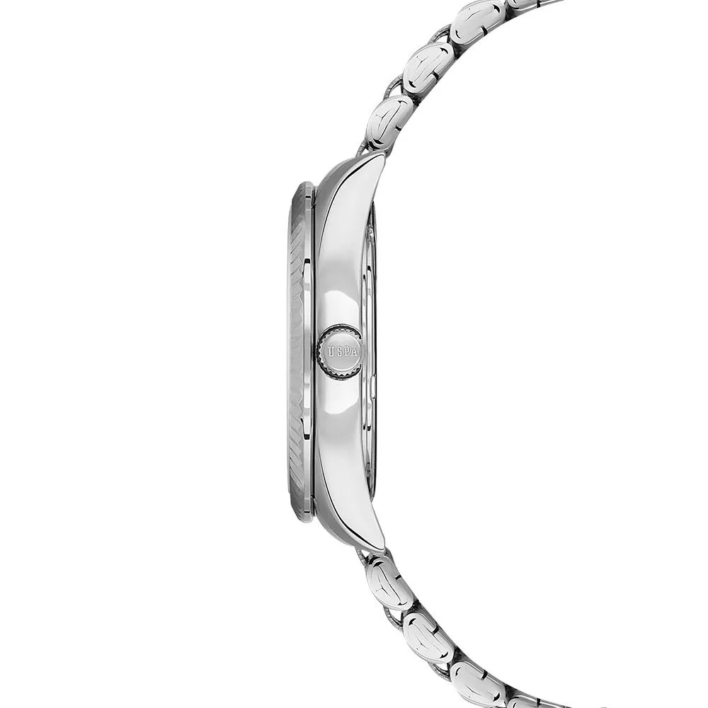 Стильные женские часы от U.S. Polo Assn с круглым корпусом и стальным браслетом. Завинчивающаяся задняя крышка. Браслет с раскладывающейся застежкой, обхват запястья до 180 мм. Вес часов 76 грамм. Гарантия 2 года.