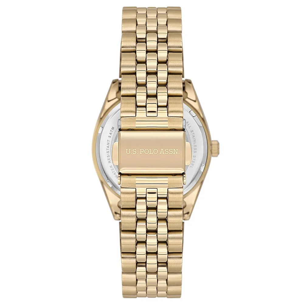 Стильные женские часы от U.S. Polo Assn с круглым корпусом и стальным браслетом. Завинчивающаяся задняя крышка. Браслет с раскладывающейся застежкой, обхват запястья до 180 мм. Вес часов 76 грамм. Гарантия 2 года.