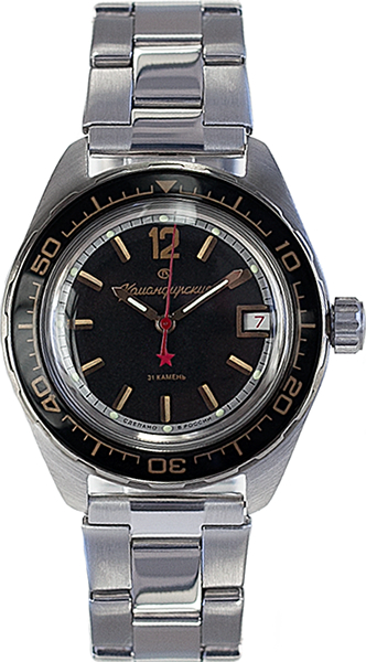Мужские механические наручные часы Восток Командирские в стальном корпусе. В механизме 31 камень, частота 19800 полуколебаний/час. Запас хода при полном заводе пружины - 31 час. Календарь мгновенного действия. Автоподзавод с предохранительным устройством от перезаводки пружины. Присутствует окошко даты. Циферблат закрывает органическое стекло сферической формы. Завинчивающаяся заводная головка. Браслет с раскладывающейся застежкой. Гарантия 1 год.