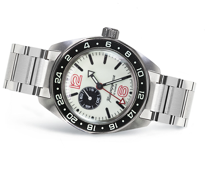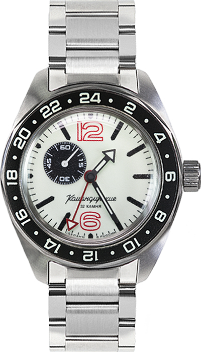 Мужские механические наручные часы Восток Командирские с дополнительной 24-х часовой стрелкой, которая делает один оборот за сутки. В механизме 32 камня. Дополнительная 24-часовая стрелка. Механизм калибра 24 мм с боковой секундной стрелкой. Автоподзавод с предохранительным устройством от перезаводки пружины. Частота: 19800 полуколебаний/час. Энергетический запас одного завода пружины – не менее 31 часа. Часовые метки и стрелки заполнены флуоресцентной краской переменного действия для возможности считывания времени в темноте. Циферблат закрывает органическое стекло сферической формы. Водозащита: 20 атмосфер (200 метров). Цельнометаллический браслет из нержавеющей стали с раскладывающейся застежкой. Вес часов 165 грамм. Гарантия 1 год.