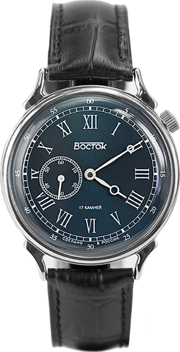 Мужские механические наручные часы Восток в классическом исполнении. Сердцем часов выступает механизм с ручным заводом "Восток 2403" калибра 24 мм (частота 19800 полуколебаний/час). Продолжительность хода от полной заводки пружины - 38 часов. Секундная стрелка вынесена на отдельный малый циферблат. Заводная головка смещена. Циферблат закрывает выпуклое органическое стекло. Корпус выполнен из часовой латуни с покрытием хромом. Задняя крышка выполнена из нержавеющей стали и декорирована гербом России. Ремешок из натуральной кожи с классической застежкой. Гарантия 1 год.