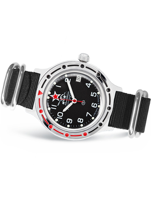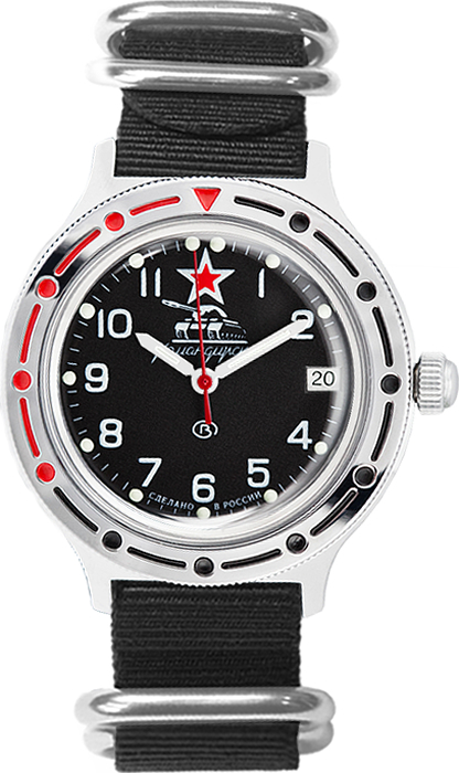 Механические часы с автоподзаводом Восток Командирские с изображением танка на черном циферблате. Механизм калибра 24 мм с центральной секундной стрелкой. В механизме 31 камень. Частота 19800 полуколебаний/час. Запас хода минимум 31 час. Противоударное устройство узла баланса. Поворачивающийся безель. Корпус из часовой латуни с покрытием хромом. Календарь мгновенного действия. Центральная секундная стрелка. На стрелки и часовые метки нанесен светонакопительный состав для возможности считывания времени в темноте. Циферблат закрывает выпуклое органическое стекло. Поворачивающийся безель. Завинчивающаяся заводная головка. Задняя крышка из нержавеющей стали. Нейлоновый ремешок с классической застежкой. Вес часов 62 грамма. Гарантия 1 год.