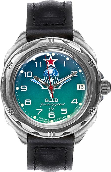 Мужские механические наручные часы Восток Командирские ВДВ. Циферблат украшает изображение подводной лодки. Механизм калибра 24 мм с центральной секундной стрелкой. В механизме 17 камней. Противоударное устройство узла баланса. Запас хода не менее 36 часов. Поворачивающийся безель. Завинчивающаяся заводная головка с защитой. Корпус выполнен из часовой латуни с покрытием оксокарбонитридом титана, придающем корпусу матовый серый цвет. Задняя крышка часов из нержавеющей стали. Циферблат закрывает органическое стекло сферической формы. На стрелки и часовые метки нанесен светонакопительный состав для возможности считывания времени в темноте. Ремешок из натуральной кожи с классической застежкой. Обхват запястья до 215 мм. Гарантия 1 год.
