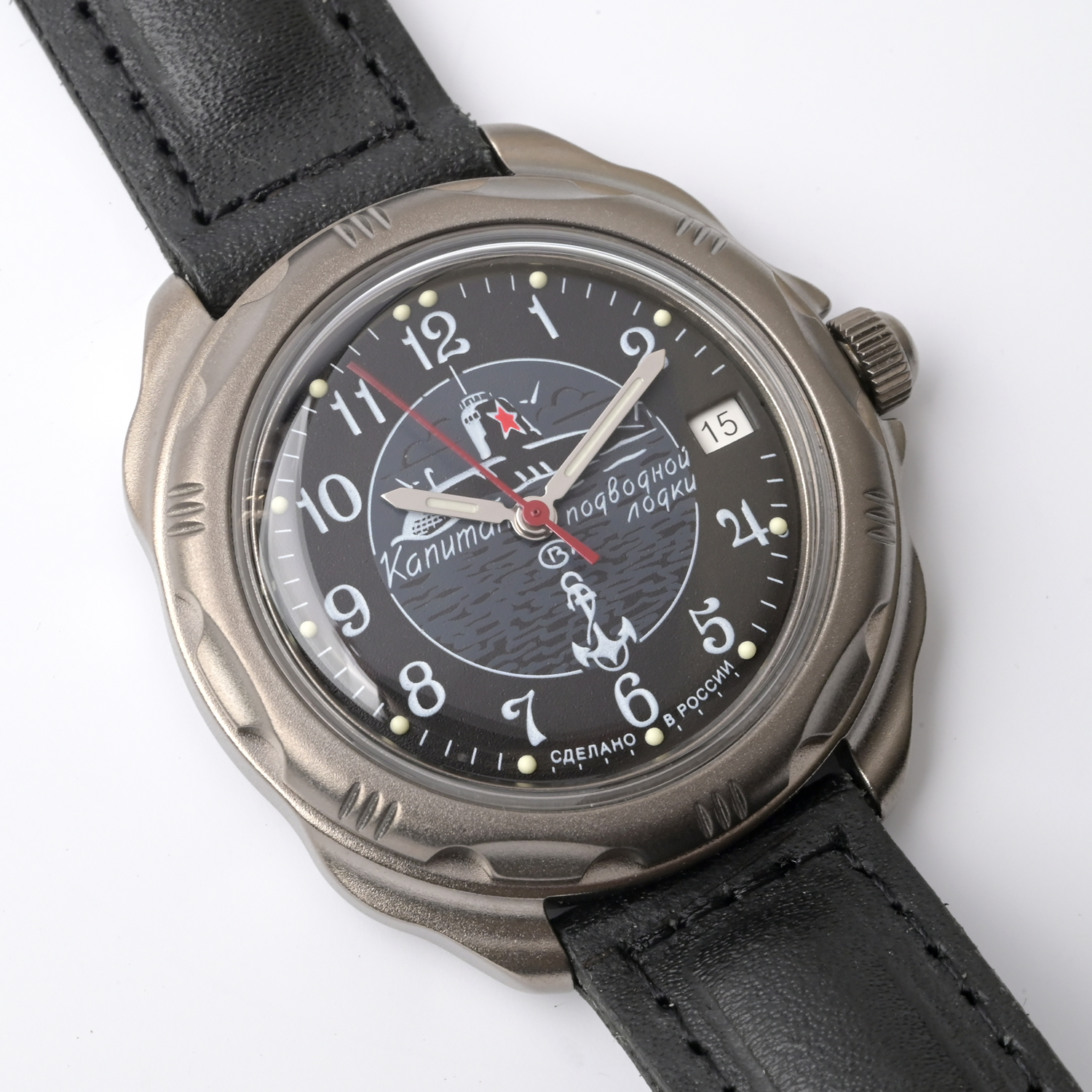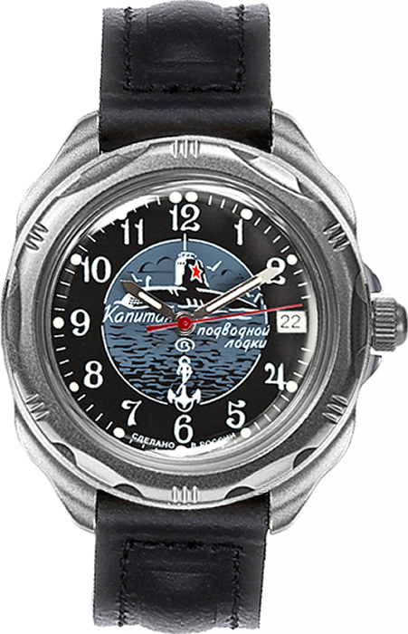 Мужские механические наручные часы Восток Командирские Капитан подводной лодки. Циферблат украшает изображение подводной лодки. Механизм калибра 24 мм с центральной секундной стрелкой. В механизме 17 камней. Противоударное устройство узла баланса. Запас хода не менее 36 часов. Поворачивающийся безель. Завинчивающаяся заводная головка с защитой. Корпус выполнен из часовой латуни с покрытием оксокарбонитридом титана, придающем корпусу матовый серый цвет. Задняя крышка часов из нержавеющей стали. Циферблат закрывает органическое стекло сферической формы. На стрелки и часовые метки нанесен светонакопительный состав для возможности считывания времени в темноте. Ремешок из натуральной кожи с классической застежкой. Обхват запястья до 215 мм. Гарантия 1 год.