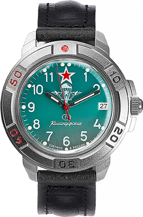 Мужские механические наручные часы Восток Командирские на кожаном ремешке. Циферблат украшает символика воздушно-десантных войск и красная звезда в 12-ти часовой отметке. Механизм калибра 24 мм с центральной секундной стрелкой. В механизме 17 камней. Противоударное устройство узла баланса. Запас хода не менее 36 часов. Поворачивающийся безель. Завинчивающаяся заводная головка с защитой. Корпус выполнен из часовой латуни с покрытием оксокарбонитридом титана, придающем корпусу матовый серый цвет. Задняя крышка часов из нержавеющей стали. Циферблат закрывает органическое стекло сферической формы. На стрелки и часовые метки нанесен светонакопительный состав для возможности считывания времени в темноте. Ремешок из натуральной кожи с классической застежкой. Обхват запястья до 215 мм. Гарантия 1 год.