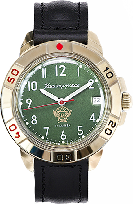 Мужские механические наручные часы Восток Командирские с сиволикой железнодорожных войск РФ. Сердцем модели является механизм Восток 2414А, в механизме 17 камней. Запас хода не менее 36 часов. Противоударное устройство узла баланса. Присутствует апертура даты. На стрелки и часовые метки нанесен светонакопительный состав для возможности считывания времени в темноте. Поворачивающийся безель. Завинчивающаяся заводная головка. Корпус выполнен из часовой латуни с покрытием нитридом титана. Циферблат закрывает выпуклое органическое стекло. Задняя крышка выполнена из нержавеющей стали. Ремешок из натуральной кожи с классической застежкой, обхват запястья до 220 мм. Вес часов 60 грамм. Гарантия 1 год.
