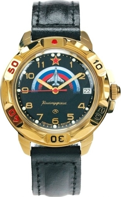Мужские механические наручные часы Восток Командирские с круглым корпусом и кожаным ремешком. Точность хода обеспечивает механизм Восток 2414А калибра 24 мм с центральной секундной стрелкой. В механизме 17 камней. Противоударное устройство узла баланса. Запас хода не менее 36 часов. На циферблате присутствует апертура текущего числа. Поворачивающийся безель. Завинчивающаяся заводная головка с защитой. Корпус выполнен из часовой латуни с покрытием нитридом титана. Задняя крышка часов из нержавеющей стали. Циферблат закрывает органическое стекло сферической формы. На стрелки и часовые метки нанесен светонакопительный состав для возможности считывания времени в темноте. Ремешок из натуральной кожи с классической застежкой. Гарантия 1 год.