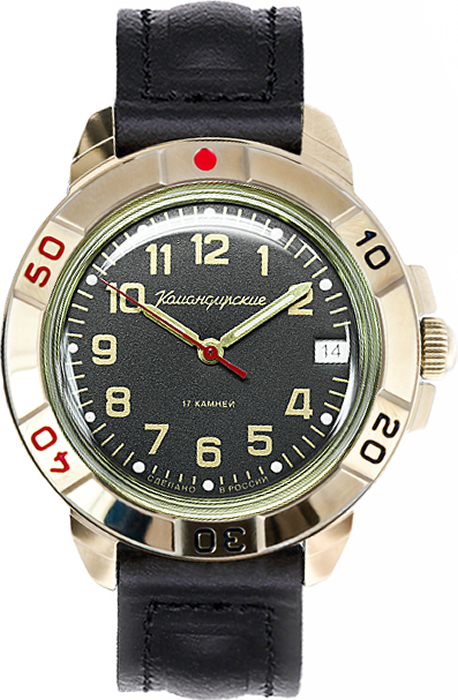 Мужские механические наручные часы Восток Командирские. Сердцем модели является механизм Восток 2414А, в механизме 17 камней. Запас хода не менее 36 часов. Противоударное устройство узла баланса. Присутствует апертура даты. На стрелки и часовые метки нанесен светонакопительный состав для возможности считывания времени в темноте. Поворачивающийся безель. Завинчивающаяся заводная головка. Корпус выполнен из часовой латуни с покрытием нитридом титана. Циферблат закрывает выпуклое органическое стекло. Задняя крышка выполнена из нержавеющей стали. Ремешок из натуральной кожи с классической застежкой, обхват запястья до 220 мм. Вес часов 60 грамм. Гарантия 1 год.