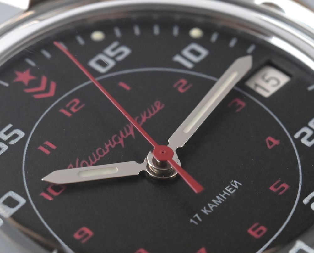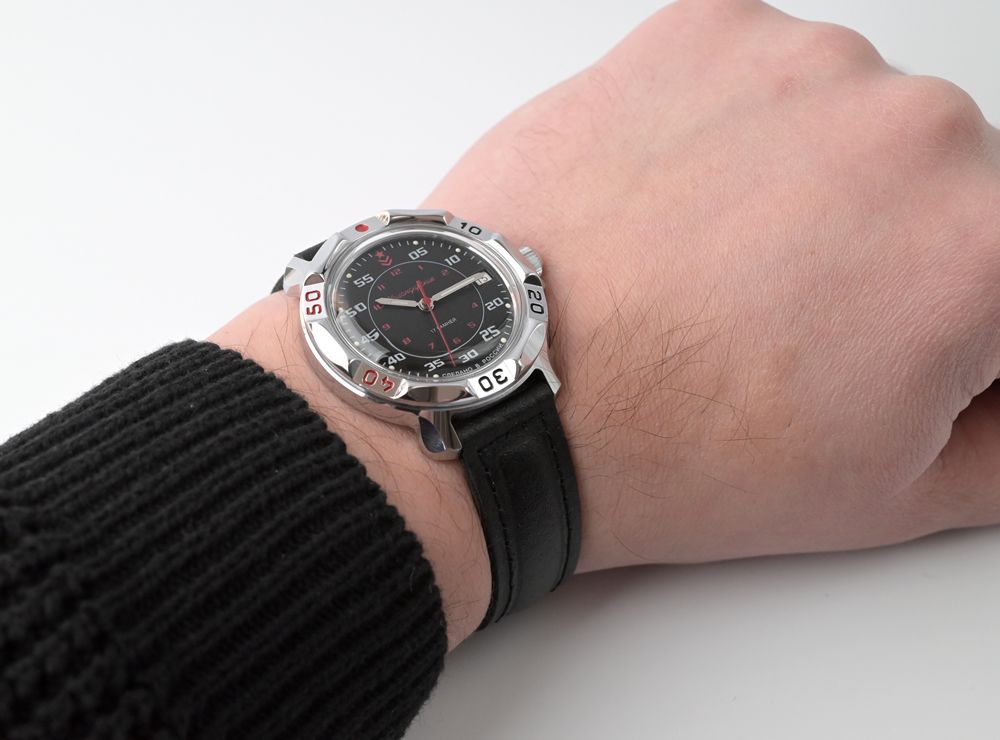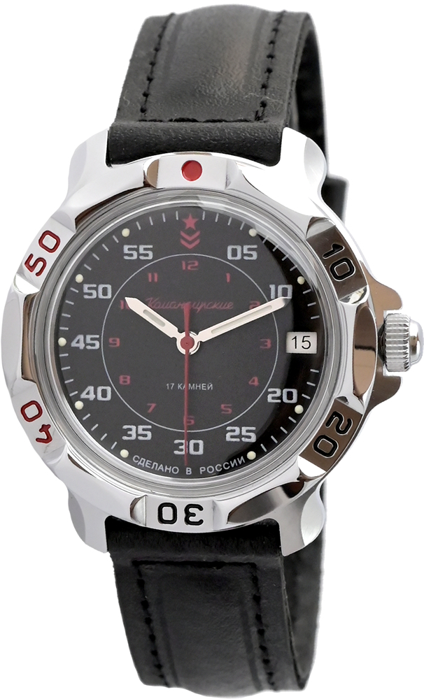 Мужские механические наручные часы Восток Командирские с черным циферблатом и дополнительной 24-х часовой разметкой. Механизм калибра 24 мм с центральной секундной стрелкой. В механизме 17 камней. Противоударное устройство узла баланса. Запас хода не менее 36 часов. Поворачивающийся безель. Завинчивающаяся заводная головка. Корпус выполнен из часовой латуни с покрытием хромом. Циферблат закрывает выпуклое органическое стекло. На стрелки и часовые метки нанесен светонакопительный состав для возможности считывания времени в темноте. Задняя крышка часов из нержавеющей стали. Ремешок из натуральной кожи с классической застежкой. Гарантия 1 год.