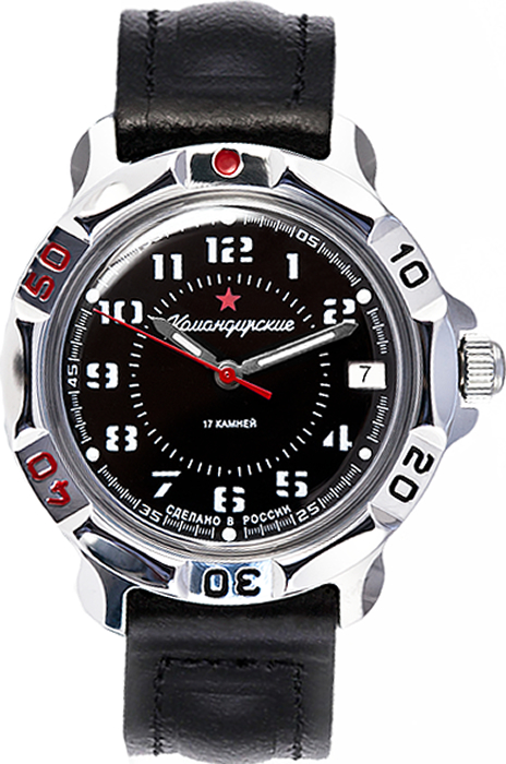 Мужские механические наручные часы Восток Командирские с черным циферблатом. Механизм калибра 24 мм с центральной секундной стрелкой. В механизме 17 камней. Противоударное устройство узла баланса. Запас хода не менее 36 часов. Поворачивающийся безель. Завинчивающаяся заводная головка. Корпус выполнен из часовой латуни с покрытием хромом. Циферблат закрывает выпуклое органическое стекло. На стрелки и часовые метки нанесен светонакопительный состав для возможности считывания времени в темноте. Задняя крышка часов из нержавеющей стали. Ремешок из натуральной кожи с классической застежкой. Гарантия 1 год.