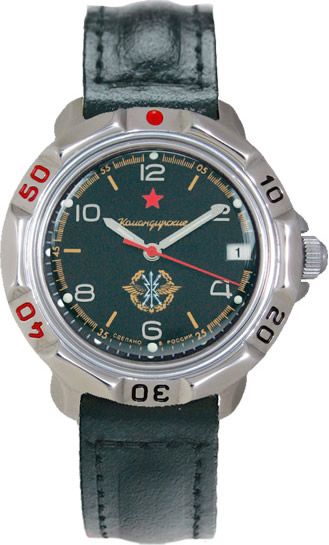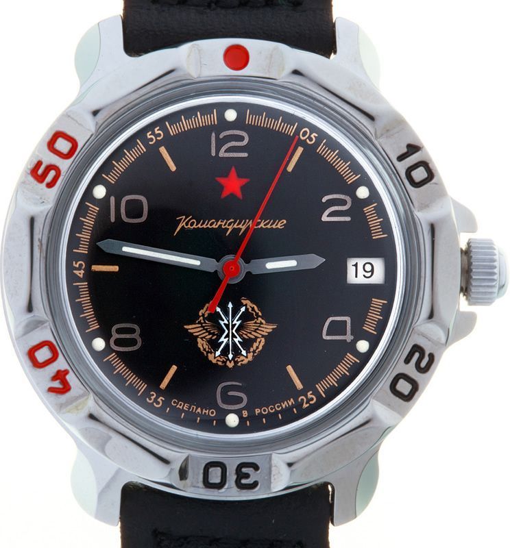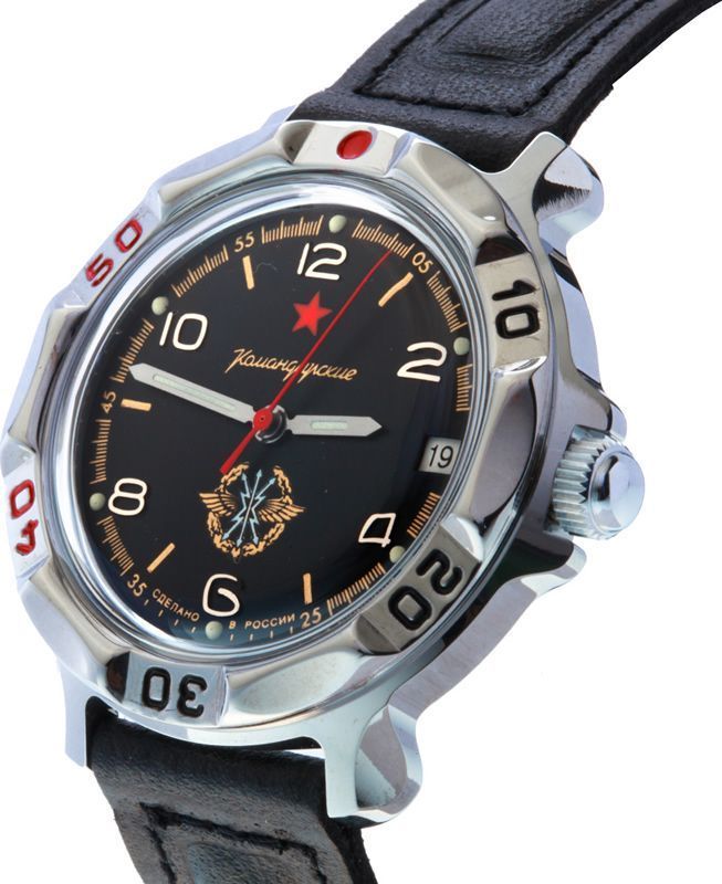 Мужские механические часы Восток Командирские с эмблемой войск связи на черном циферблате. Механизм калибра 24 мм с центральной секундной стрелкой. В механизме 17 камней. Противоударное устройство узла баланса. Запас хода не менее 36 часов. На стрелки и часовые метки нанесен светонакопительный состав. Поворачивающийся безель. Завинчивающаяся заводная головка. Корпус выполнен из часовой латуни с покрытием хромом. Циферблат закрывает выпуклое органическое стекло. Задняя крышка часов из нержавеющей стали. Ремешок из натуральной кожи с классической застежкой. Гарантия 1 год.