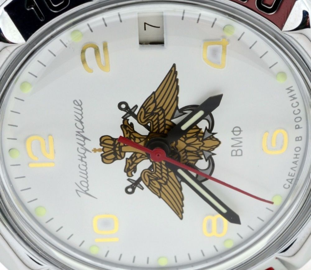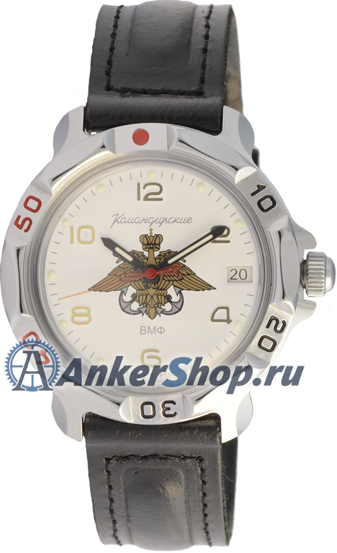 Мужские механические часы Восток Командирские ВМФ. Механизм калибра 24 мм с центральной секундной стрелкой. В механизме 17 камней. Противоударное устройство узла баланса. Запас хода не менее 36 часов. Поворачивающийся безель. Завинчивающаяся заводная головка. Корпус выполнен из часовой латуни с покрытием хромом. Циферблат закрывает выпуклое органическое стекло. На стрелки и часовые метки нанесен светонакопительный состав для возможности считывания времени в темноте. Задняя крышка часов из нержавеющей стали. Ремешок из натуральной кожи с классической застежкой. Гарантия 1 год.