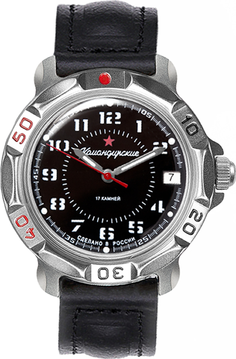 Мужские механические наручные часы Восток Командирские с белыми цифрами на черном циферблате. Механизм Восток 2414А калибра 24 мм с центральной секундной стрелкой. В механизме 17 камней. Противоударное устройство узла баланса. Запас хода не менее 36 часов. Циферблат закрывает выпуклое органическое стекло. На стрелки и часовые метки нанесен светонакопительный состав для возможности считывания времени в темноте. Поворачивающийся безель. Завинчивающаяся заводная головка с защитой. Корпус выполнен из часовой латуни с покрытием оксокарбонитридом титана. Задняя крышка часов из нержавеющей стали. Ремешок из натуральной кожи с классической застежкой. Обхват запястья от 180 до 215 мм. (длина ремешка 75+115 мм). Вес часов 60 грамм. Гарантия 1 год.