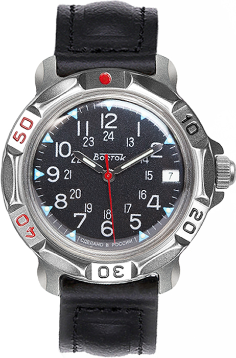 Мужские механические наручные часы Восток Командирские с 12-ти и 24-х часовой разметкой на черном циферблате. Механизм Восток 2414А калибра 24 мм с центральной секундной стрелкой. В механизме 17 камней. Противоударное устройство узла баланса. Запас хода не менее 36 часов. Циферблат закрывает выпуклое органическое стекло. На стрелки и часовые метки нанесен светонакопительный состав для возможности считывания времени в темноте. Поворачивающийся безель. Завинчивающаяся заводная головка с защитой. Корпус выполнен из часовой латуни с покрытием оксокарбонитридом титана. Задняя крышка часов из нержавеющей стали. Ремешок из натуральной кожи с классической застежкой. Обхват запястья от 180 до 215 мм. (длина ремешка 75+115 мм). Вес часов 60 грамм. Гарантия 1 год.