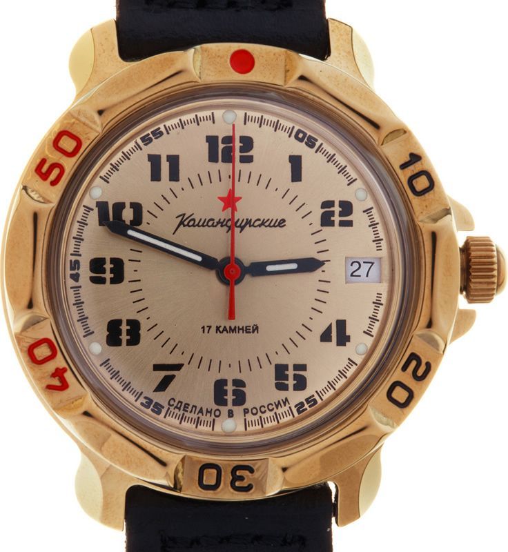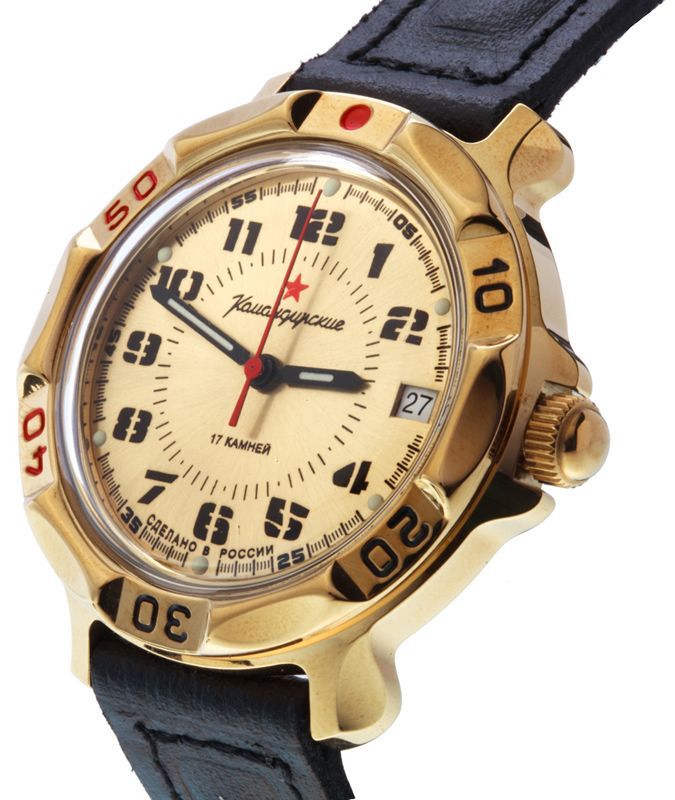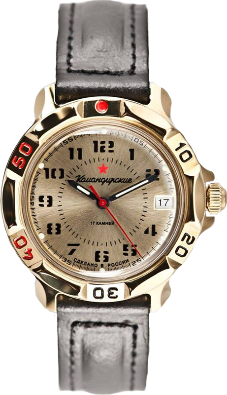 Мужские механические часы Восток Командирские 819121 на кожаном ремешке. Механизм "Восток 2414А" калибра 24 мм с центральной секундной стрелкой. В механизме 17 камней. Запас хода не менее 36 часов. Противоударное устройство узла баланса. Поворачивающийся безель. На стрелки и часовые метки нанесен светонакопительный состав для возможности считывания времени в темноте. Циферблат закрывает выпуклое органическое стекло. Корпус выполнен из часовой латуни с покрытием нитридом титана. Завинчивающаяся заводная головка. Задняя крышка из нержавеющей стали. Водозащита модели составляет 2 атмосферы (WR20). Толщина корпуса 11 мм. Ремешок из натуральной кожи с классической застежкой. Обхват запястья от 180 до 215 мм. (длина ремешка 75+115 мм). Вес часов 60 грамм. Гарантия 1 год.