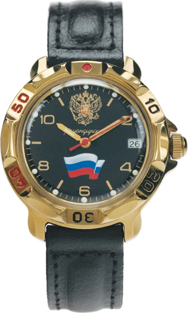 Легендарные мужские механические часы Восток Командирские с гербом и флагом РФ на циферблате. Механизм Восток 2414А калибра 24 мм с центральной секундной стрелкой. В механизме 17 камней. Запас хода не менее 36 часов. Противоударное устройство узла баланса. Поворачивающийся безель. Корпус из часовой латуни с покрытием нитрида титана. Задняя крышка из нержавеющей стали. Выпуклое органическое стекло. Завинчивающаяся заводная головка. Ремешок из натуральной кожи с классической застежкой. Обхват запястья от 180 до 215 мм. (длина ремешка 75+115 мм). Вес часов 60 грамм. Гарантия 1 год.