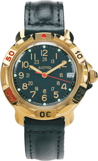 Мужские механические наручные часы Восток Командирские. Механизм калибра 24 мм с центральной секундной стрелкой. В механизме 17 камней. Противоударное устройство узла баланса. Запас хода не менее 36 часов. Поворачивающийся безель. Завинчивающаяся заводная головка. Корпус выполнен из часовой латуни с покрытием нитридом титана. Циферблат закрывает выпуклое органическое стекло. На стрелки и часовые метки нанесен светонакопительный состав для возможности считывания времени в темноте. Задняя крышка часов из нержавеющей стали. Ремешок из натуральной кожи с классической застежкой. Обхват запястья от 180 до 215 мм. (длина ремешка 75+115 мм). Вес часов 60 грамм. Гарантия 1 год.