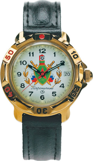 Мужские механические наручные часы Восток Командирские Пограничные. Механизм калибра 24 мм с центральной секундной стрелкой. В механизме 17 камней. Противоударное устройство узла баланса. Запас хода не менее 36 часов. Поворачивающийся безель. Завинчивающаяся заводная головка. Корпус выполнен из часовой латуни с покрытием нитридом титана. Циферблат закрывает выпуклое органическое стекло. На стрелки и часовые метки нанесен светонакопительный состав для возможности считывания времени в темноте. Задняя крышка часов из нержавеющей стали. Ремешок из натуральной кожи с классической застежкой. Обхват запястья от 180 до 215 мм. (длина ремешка 75+115 мм). Вес часов 60 грамм. Гарантия 1 год.