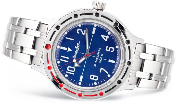 Мужские наручные часы Восток Амфибия на стальном браслете. Точность хода обеспечивает механизм Восток 2415.01 с автоподзаводом. В механизме 31 камень. Противоударное устройство узла баланса. Энергетический запас одного завода пружины - не менее 33 часов. Циферблат закрывает выпуклое органическое стекло. Поворачивающийся безель. Завинчивающаяся заводная головка. Браслет с раскладывающейся застежкой, застежка с системой блокировки. Вес часов 128 грамм. Гарантия 12 месяцев.