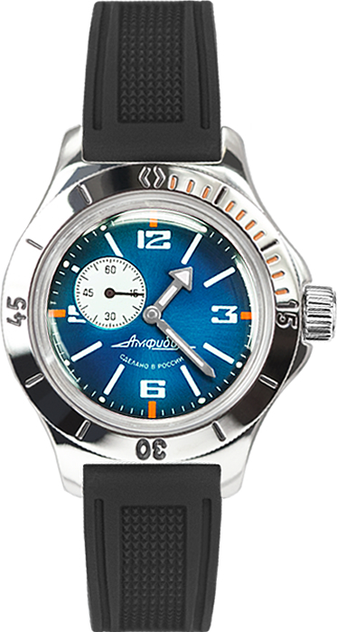 Мужские механические часы Восток Амфибия с вынесенной на отдельный циферблат секундной стрелкой. В механизме 31 камень. Автоподзавод с предохранительным устройством от перезавода пружины. Энергетический запас одного завода пружины – не менее 33 часов. Противоударное устройство узла баланса. Часовые метки и стрелки заполнены флуоресцентной краской переменного действия для возможности считывания времени в темноте. Циферблат закрывает органическое стекло сферической формы. Завинчивающаяся заводная головка. Водозащита: 20 атмосфер (200 метров). Ремень из полиуретана с классической застежкой. Вес часов 81 грамм. Гарантия 12 месяцев.