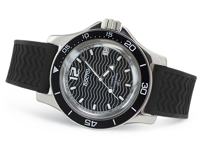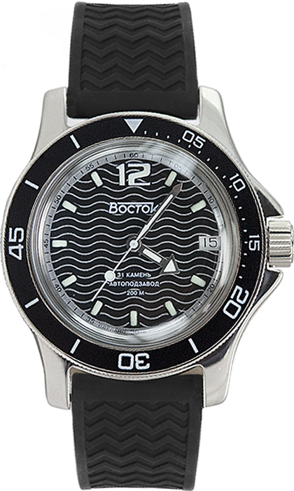 Мужские механические часы Восток Амфибия на полиуретановом ремешке. Циферблат украшает волнистый рисунок. Сердцем часов выступает механизм Восток 2416. В механизме 31 камень. Автоподзавод с предохранительным устройством от перезавода пружины. Центральная секундная стрелка. Противоударное устройство узла баланса. Календарь мгновенного действия. Энергетический запас одного завода пружины – не менее 31 часа. Часовые метки и стрелки заполнены флуоресцентной краской переменного действия для возможности считывания времени в темноте. Циферблат закрывает органическое стекло сферической формы. Безель вращается во всех направлениях. Завинчивающаяся заводная головка с защитой. Ремешок с классической застежкой. Вес часов 89 грамм. Гарантия 12 месяцев.