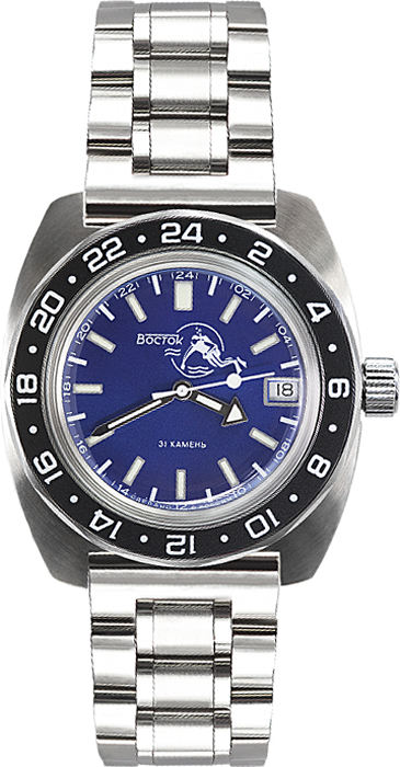 Мужские механические наручные часы Восток Амфибия с 24-х часовым отображением времени (часовая стрелка делает один оборот за сутки). В механизме 31 камень. Автоподзавод с предохранительным устройством от перезавода пружины. Календарь мгновенного действия. Центральная секундная стрелка. Противоударное устройство узла баланса. Энергетический запас одного завода пружины – не менее 31 часа. Часовые знаки, цифры и стрелки заполнены флуоресцентной краской переменного действия для возможности считывания времени в темноте. Циферблат закрывает органическое стекло сферической формы. Водозащита: 20 атмосфер (200 метров). Цельнометаллический браслет из нержавеющей стали с раскладывающейся застежкой. Вес часов 132 грамма. Гарантия 12 месяцев.