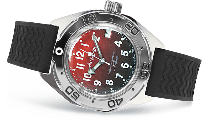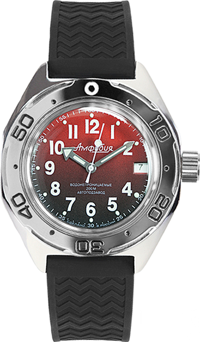 Мужские наручные часы Восток Амфибия на резиновом ремешке. В механизме 31 камень. Запас хода не менее 31 часа. Автоподзавод с предохранительным устройством от перезавода пружины. Календарь мгновенного действия. Центральная секундная стрелка. Противоударное устройство узла баланса. Часовые метки и стрелки заполнены флуоресцентной краской переменного действия для возможности считывания времени в темноте. Циферблат закрывает органическое стекло сферической формы. Вращающийся безель. Завинчивающаяся заводная головка. Ремень из полиуретана с классической застежкой. Вес часов 90 грамм. Гарантия 12 месяцев.